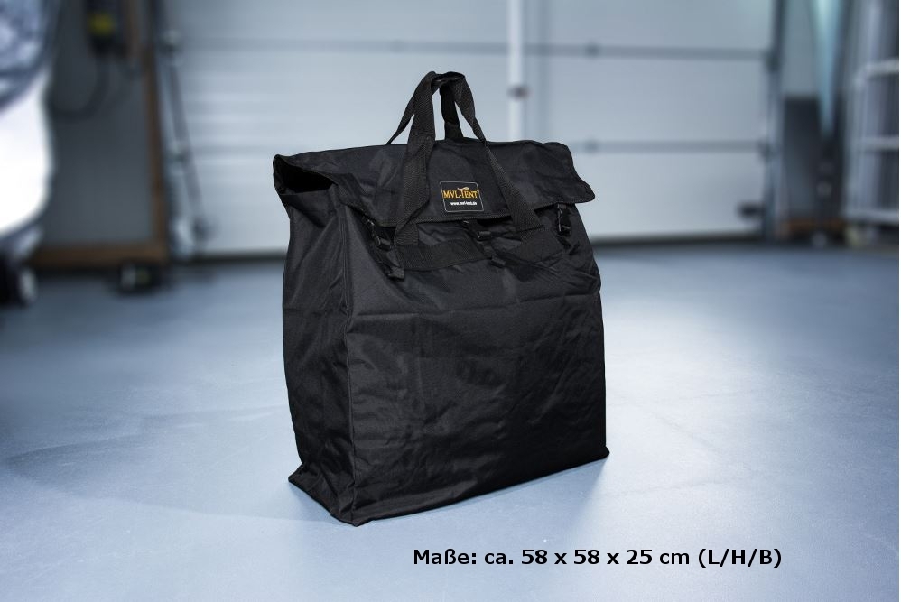 Mit bogenförmigem Reissverschluß und Innentaschen für das Zubehör. Farbe: Schwarz. - Befestigungsset (Heringe + Spanngurte)