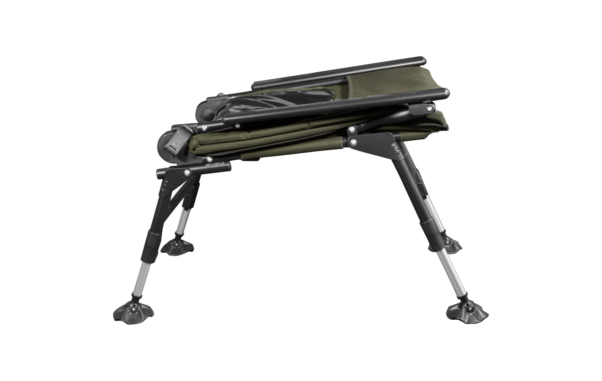 Das leichte, dennoch sehr robuste Stahlgestell und die höhenverstellbare Schlammfüße sorgen für einen absolut wackelfreien und stabilen Stand. Zudem verhindern die Schlammfüße das Einsinken in einen weichen Untergrund. Durch leichtes Betätigen des Verschlussmechanismus lassen sich die Füße stufenlos auf die gewünschte Höhe verstellen.