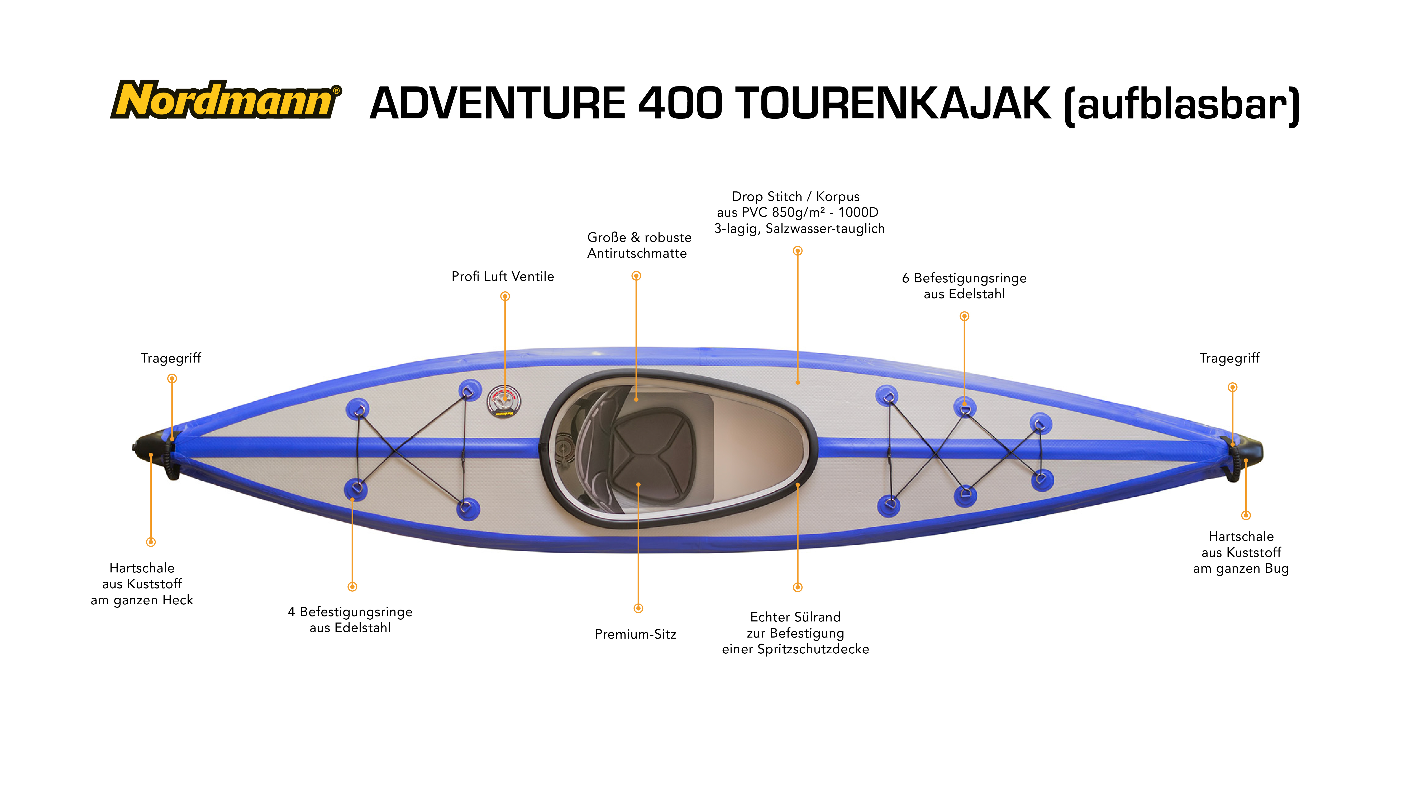 Alles an diesem Drop Stitch Kajak ist auf Schnelligkeit, Wendigkeit, Robustheit in Kombination mit hohem Paddelkopfort ausgerichtet. Ausgestattet mit umfangreichem, hochwertigem Zubehör eignet sich unser Nordmann® Adventure 400 optimal sowohl für lange Paddeltouren, als auch für gelegentliche Kurzausflüge!Neu und nur bei Nordmann®! - unsere Adventure Kajaks verfügen über einen festen Süllrand!
