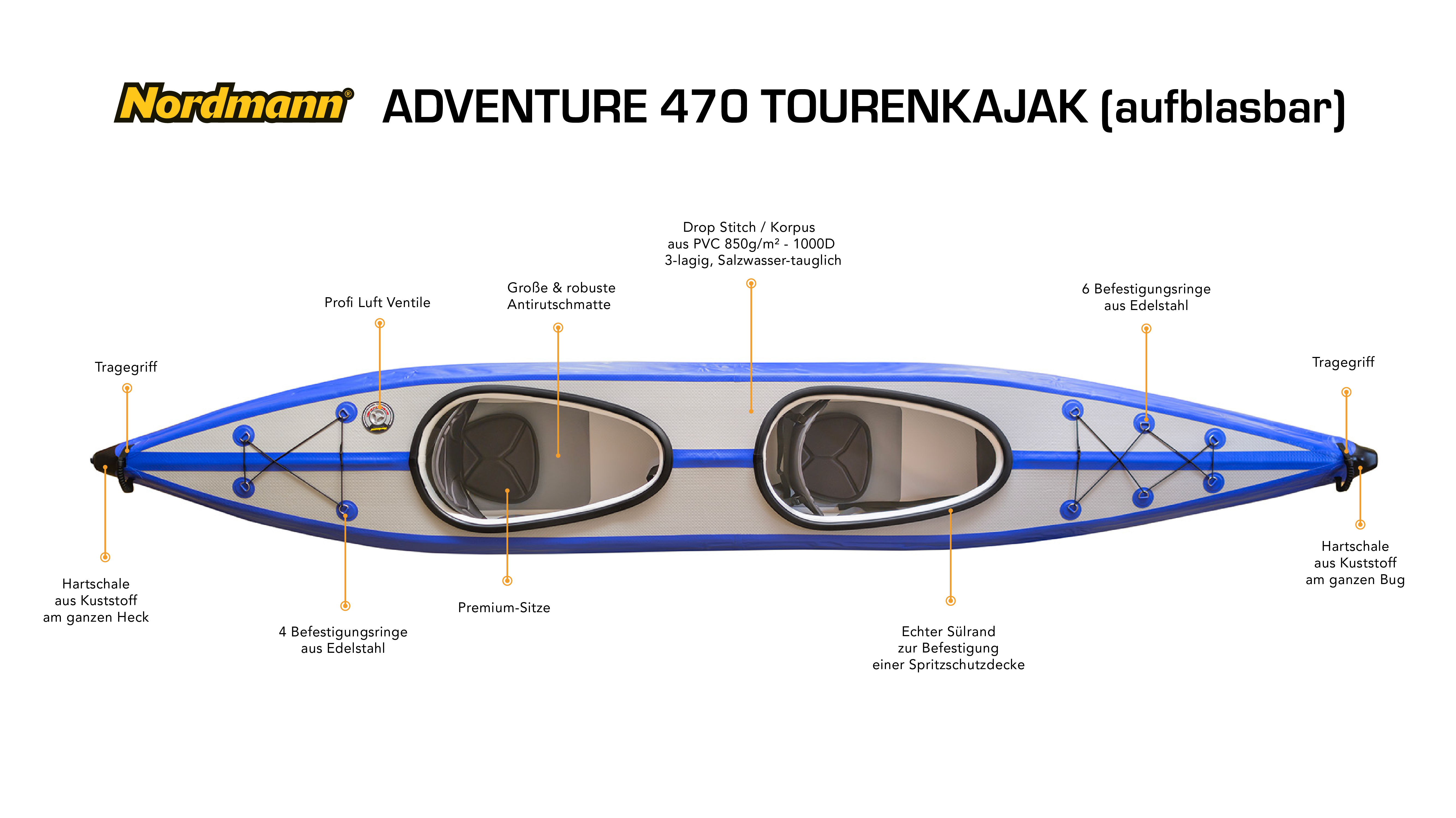 Alles an diesem Drop Stitch Kajak ist auf Schnelligkeit, Wendigkeit, Robustheit in Kombination mit hohem Paddelkopfort ausgerichtet. Ausgestattet mit umfangreichem, hochwertigem Zubehör eignet sich unser Nordmann® Adventure 470 optimal sowohl für lange Paddeltouren, als auch für gelegentliche Kurzausflüge!Neu und nur bei Nordmann®! - unsere Adventure Kajaks verfügen über einen festen Süllrand!